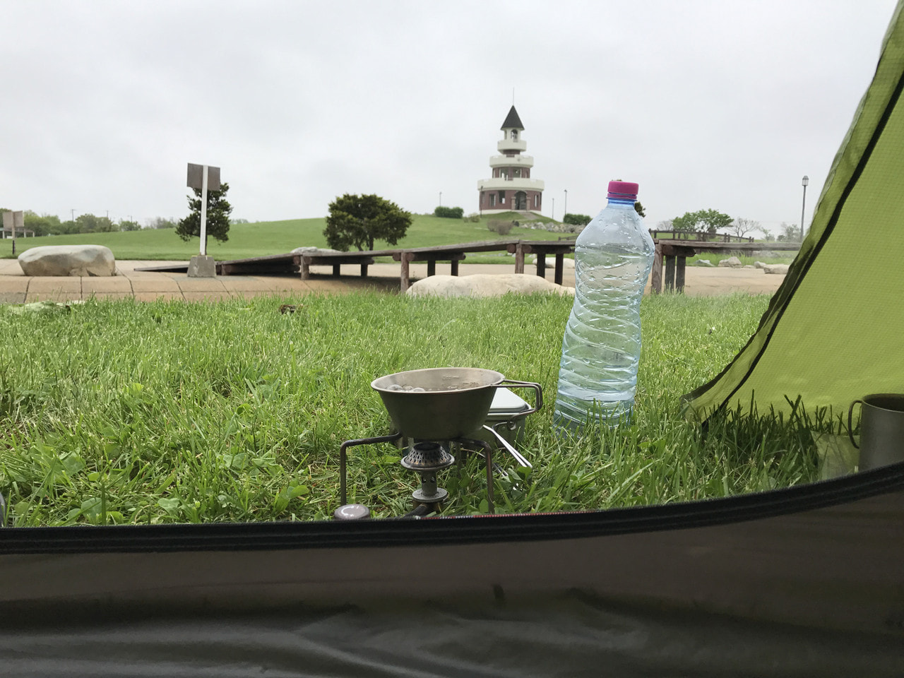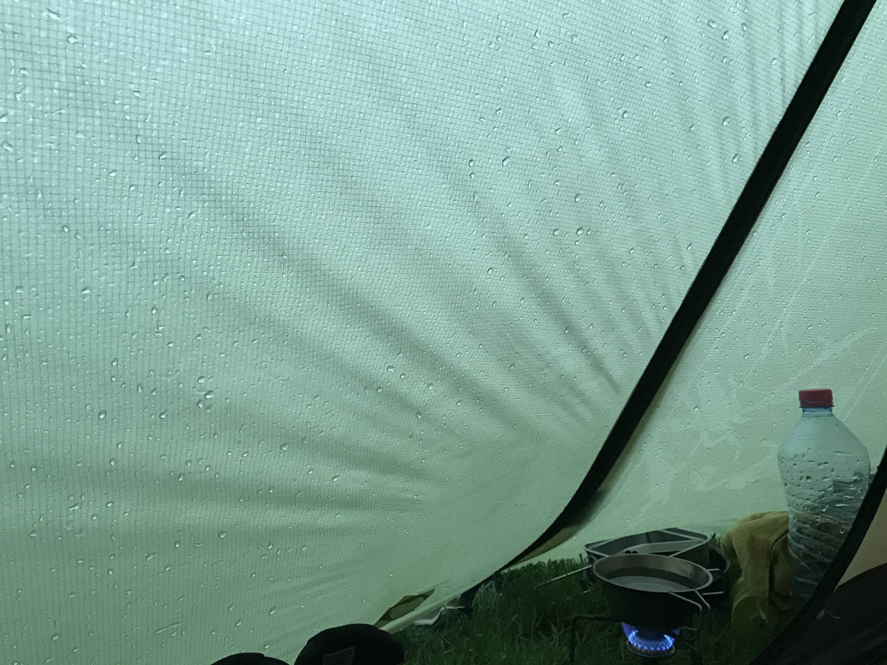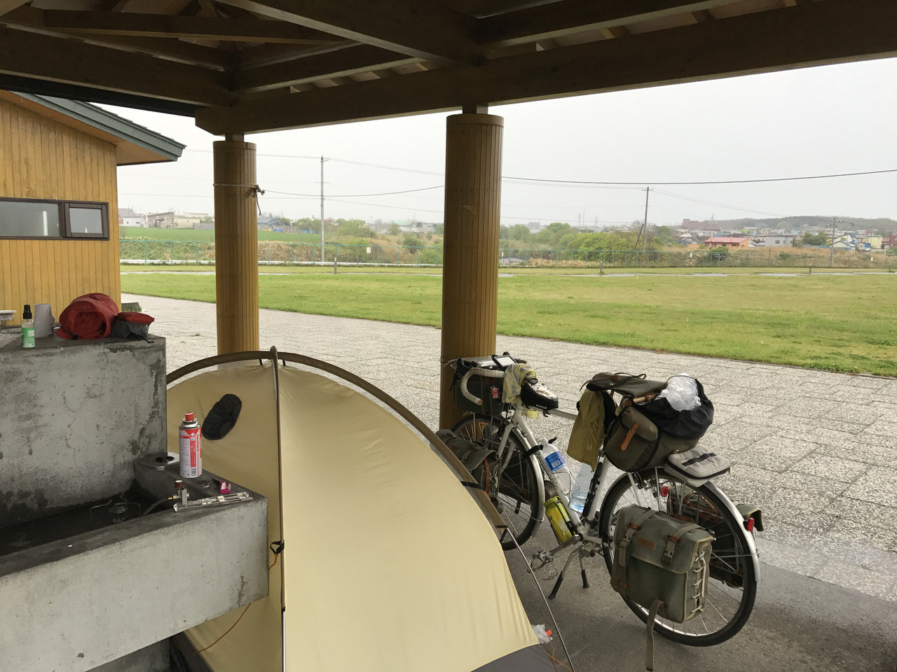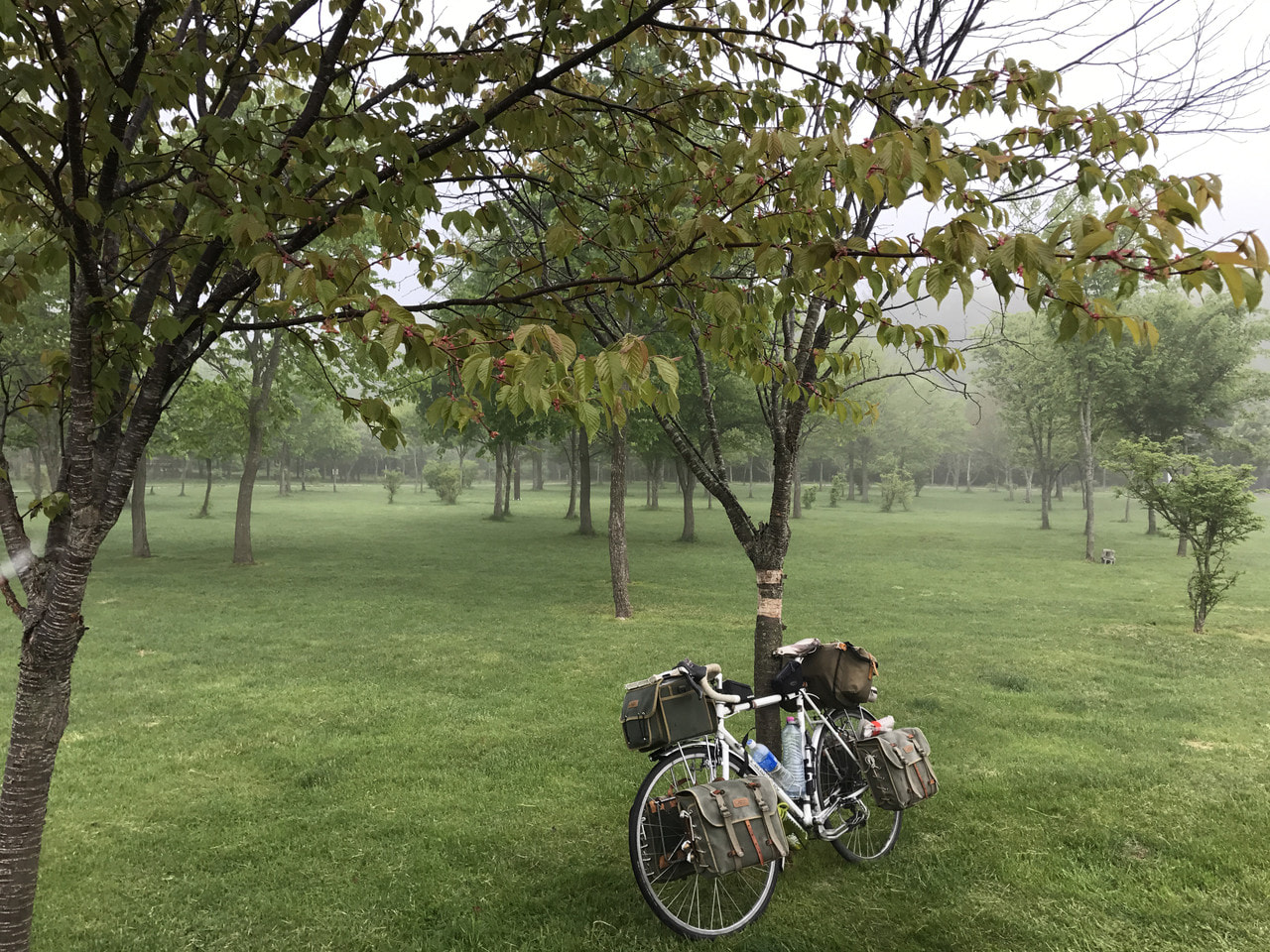 4時半起床。霧でテントはビッショリ。 乾かすつもりで自転車に掛けていたタオルも逆...